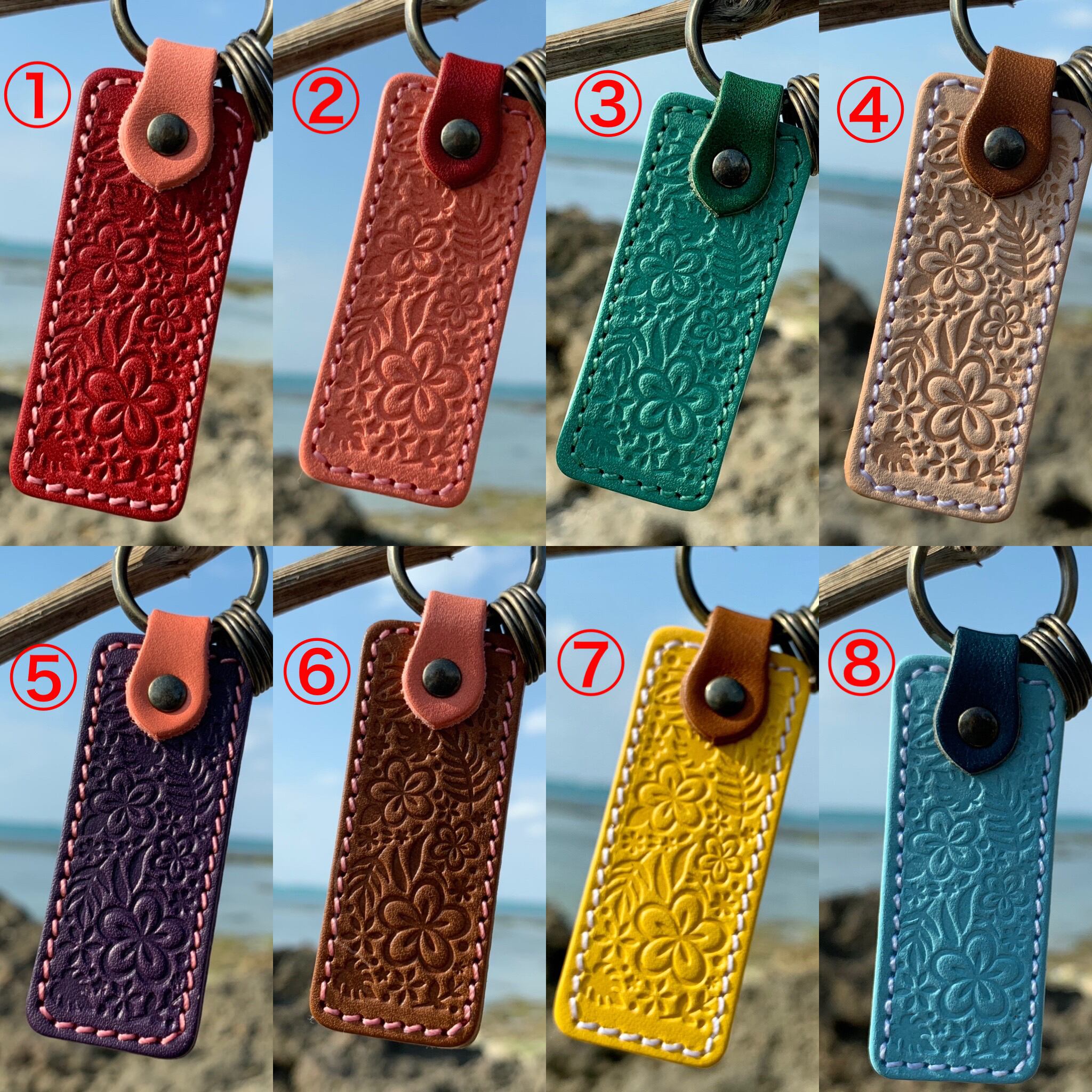 ①赤・②ピンク・③ターコイズ・④ナチュラル・⑤紫・⑥茶・⑦黄・⑧水色